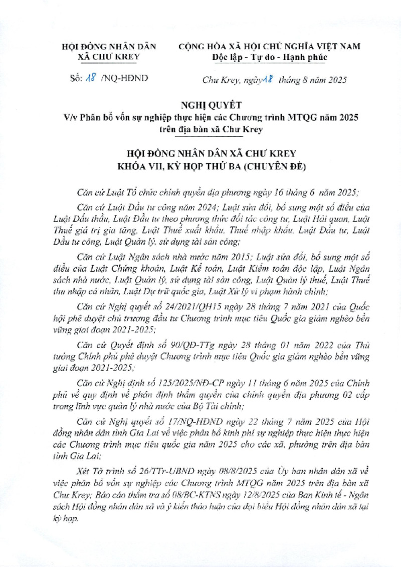 | Tiêu đề văn bản | Nghị quyết Phân bổ vốn sự nghiệp thực hiện các Chương trình MTQG năm 2025 trên địa bàn xã Chư Krey | ||