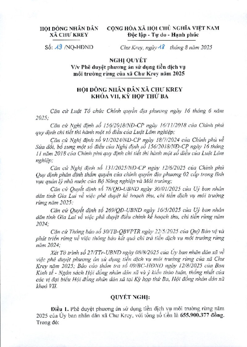 | Tiêu đề văn bản | Nghị quyết Phê duyệt phương án sử dụng tiền dịch vụ môi trường rừng của xã Chư Krey năm 2025 | ||