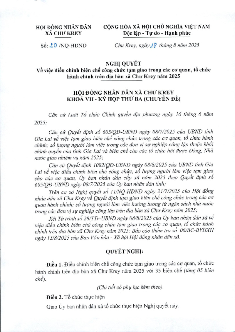 | Tiêu đề văn bản | Nghị quyết Về việc điều chỉnh biên chế công chức tạm giao trong các cơ quan, tổ chức hành chính trên địa bàn xã Chư Krey năm 2025 | ||